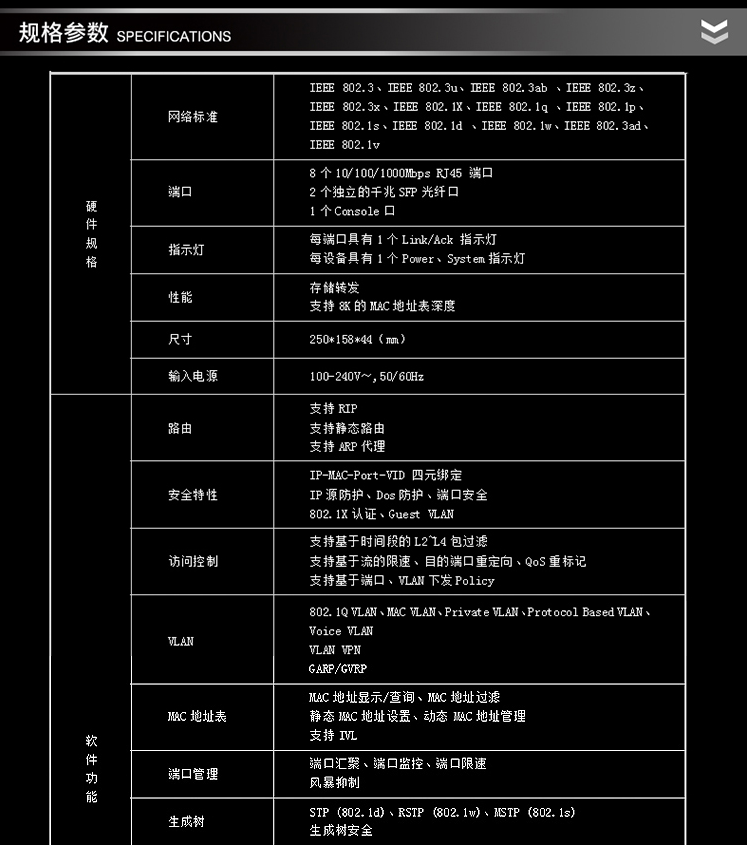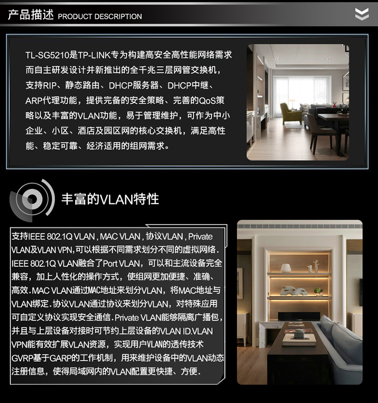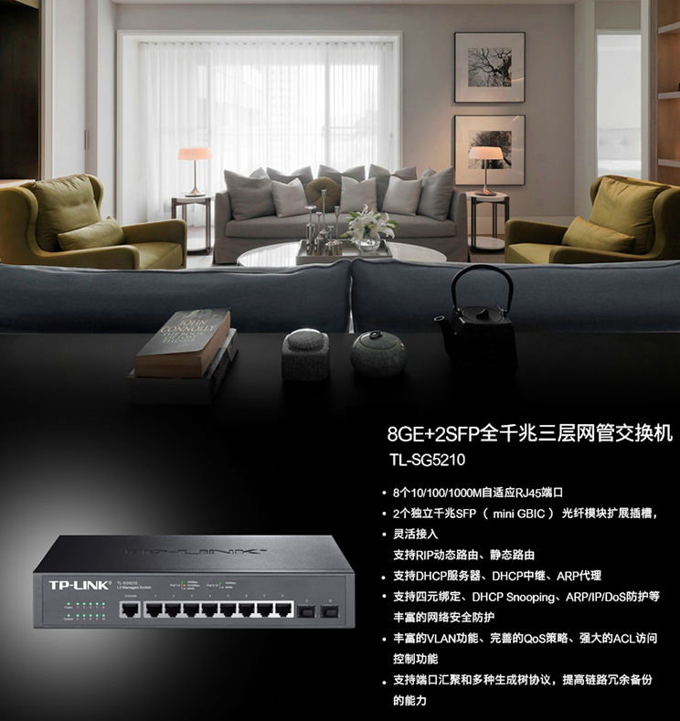 以太网交换机普联/TP-LINK8口全千兆三层交换机带2光纤光口可网管VLAN网络企业级TL-SG5210/台