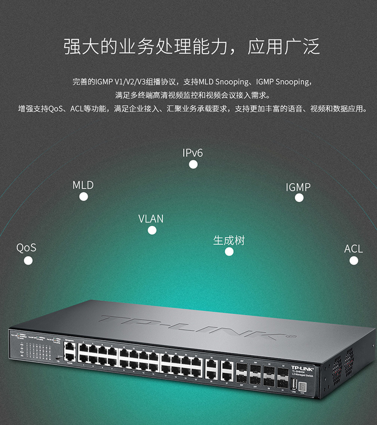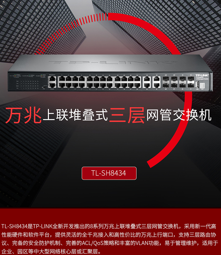 以太网交换机普联/TP-LINK28千兆网口4光口机架式万兆上联堆叠式三层网管交换机TL-SH8434/台