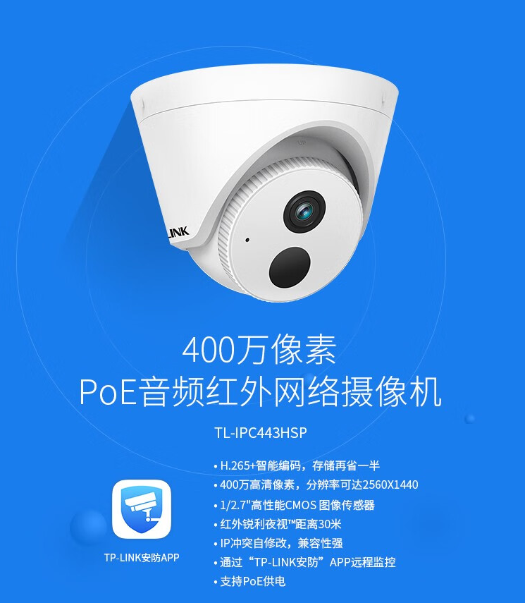 监控摄像机普联/TP-LINK红外夜视拾音半球 有线监控 高清夜视TL-IPC433HSP/台