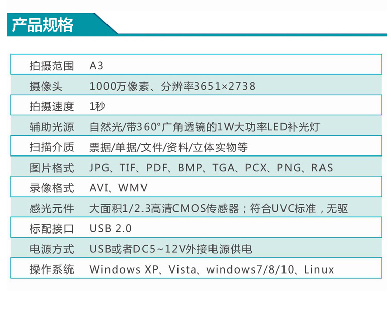 像素(高拍仪)  :   1000W