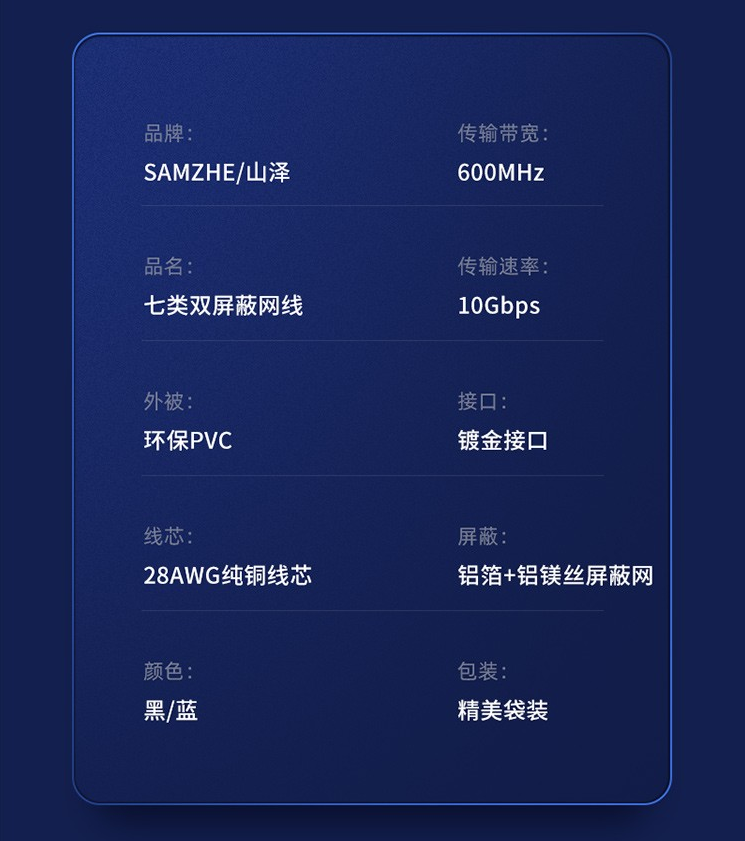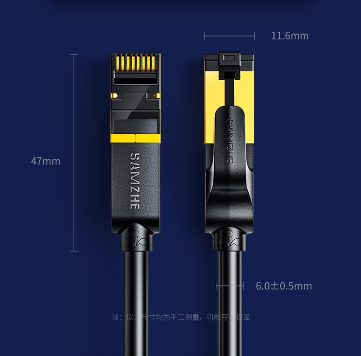 网络连接设备山泽(SAMZHE)工程级万兆七类CAT7纯铜镀金双屏蔽超高速网络跳线黑色20米CAT-720H/根