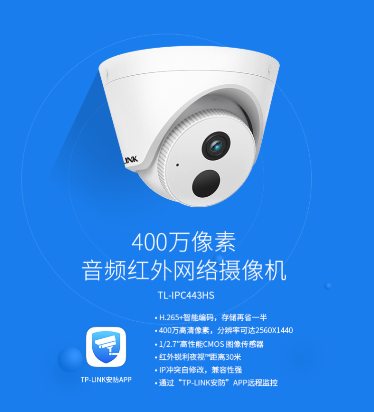 监控摄像机普联/TP-LINK红外音频网络摄像机400万像素室外监控器摄像头TL-IPC443HS/台